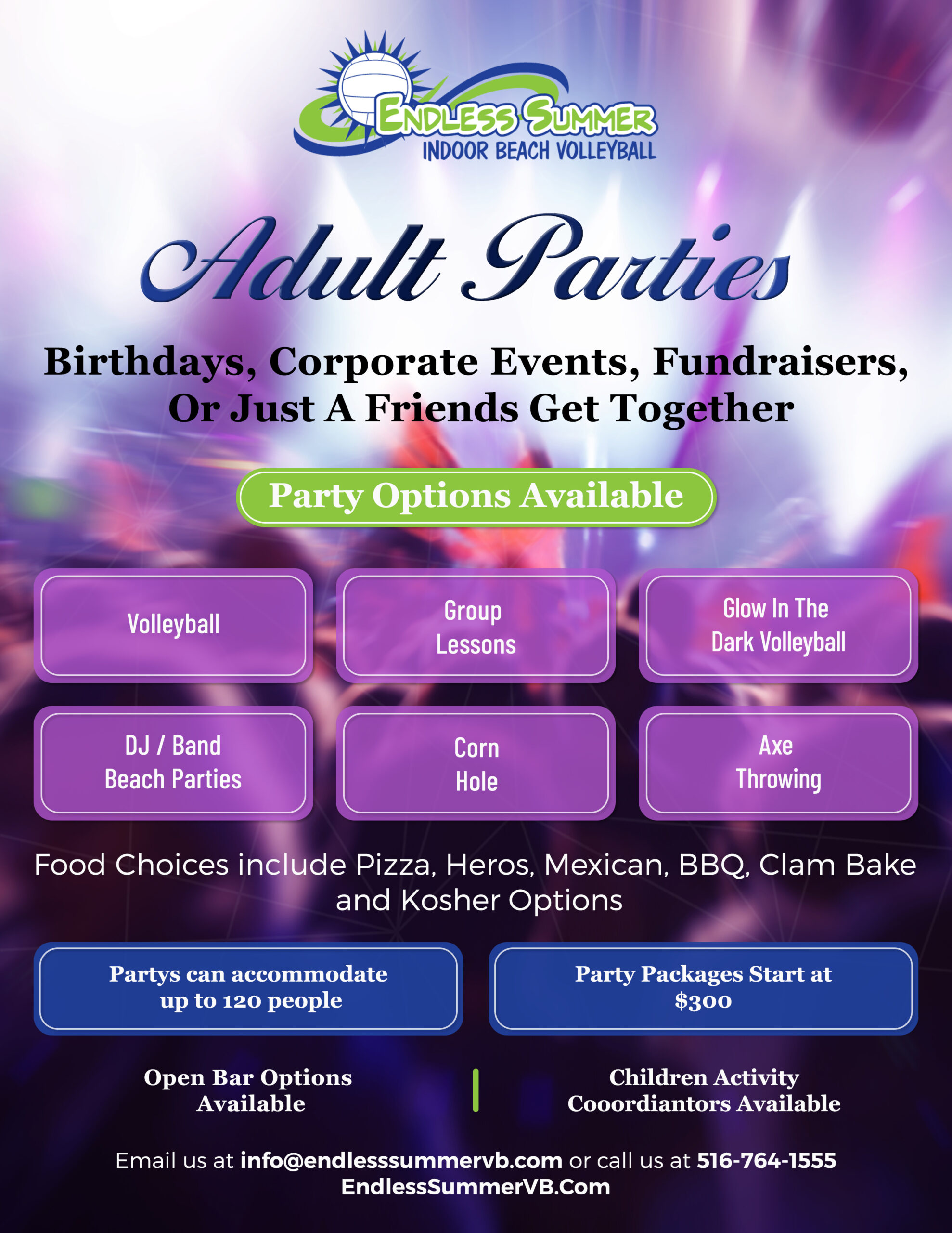 – Come down as a group or as a single and join a team any time from 6 PM till Midnight on one of our 2 SAND Courts – 1 Competitive and 1 Recreational All Night Long