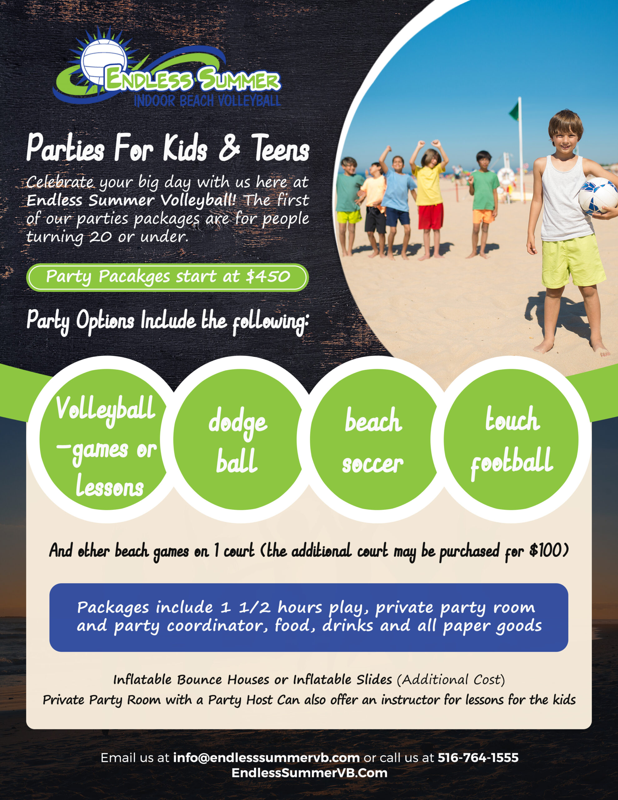 Endless Summer is an amazing place to learn and progress in the sport of volleyball. Playing on the sand makes it fun and enjoyable for the younger ones to learn and the resistance of the sand strengthens growing athletes while providing a more forgiving surface versus hard court alternatives.