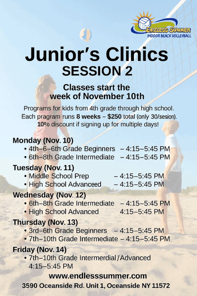 Endless Summer is an amazing place to learn and progress in the sport of volleyball. Playing on the sand makes it fun and enjoyable for the younger ones to learn and the resistance of the sand strengthens growing athletes while providing a more forgiving surface versus hard court alternatives.